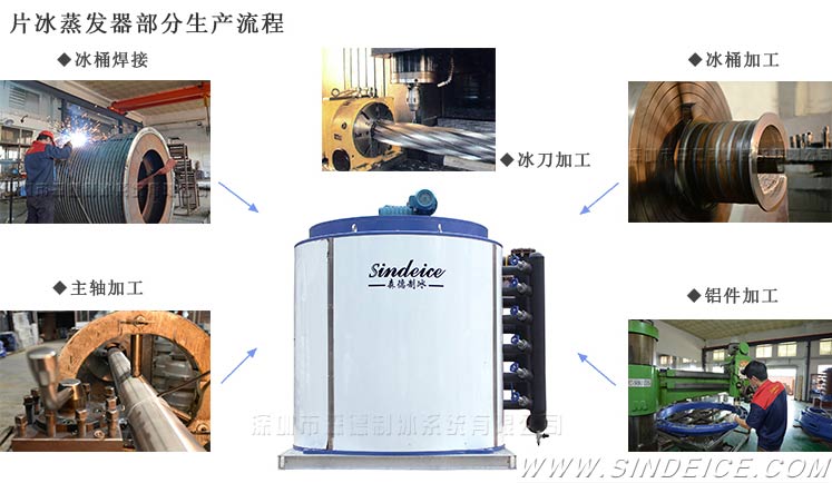 片冰機蒸發器熟稱冰桶,是片冰機制冰組件。低溫的冷凝液態制冷劑通過蒸發器,與流經蒸發器內壁的水進行熱交換,氣化吸熱,把水降至0℃以下,迅速結成冰,轉動的減速機帶動冰刀把冰片刮落。蒸發器的質量,直接影響片冰機產冰效果和片冰質量。蒸發器如此重要,蒸發器有哪些構成?